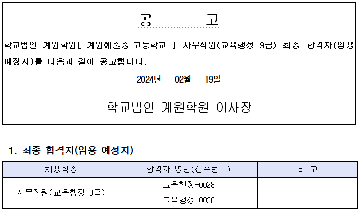 °è¿ø¿¹¼úÁß⋅°íµîÇб³ Á÷¿ø¼±¹ß ÃÖÁ¾ÇÕ°ÝÀÚ ¹ßÇ¥
