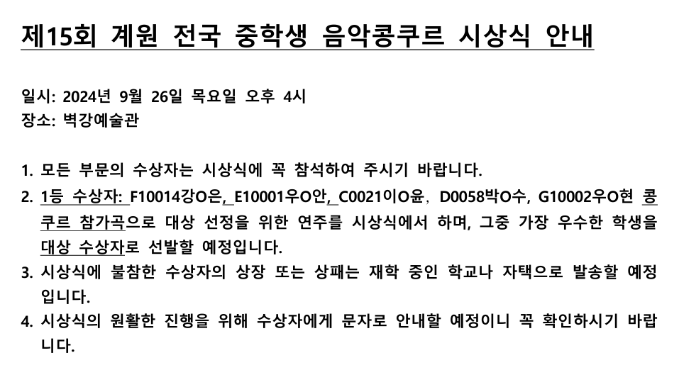 Á¦15ȸ °è¿øÀü±¹ÁßÇлý À½¾ÇÄáÄí¸£ ¼ö»óÀÚ ¸í´ÜÀ» °ø°íÇÕ´Ï´Ù.